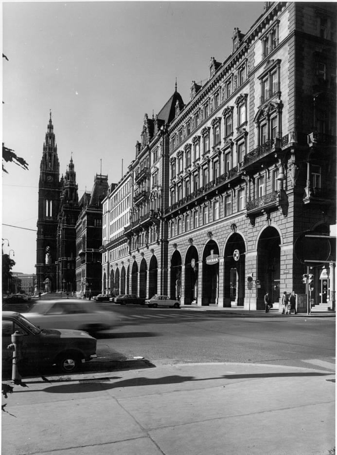 Kehren wir zum Ausgangspunkt zurück, dem Primat der Zeile vor dem Einzelobjekt als Individuum. Tatsächlich gab es seit der Biedermeierzeit immer wieder Versuche, die oft als eintönig betrachtete Addition zu durchbrechen, indem man die Häuser in symmetrische Beziehung zueinander setzte, etwa in dem ein Haus mit übergiebelter Fassade von zwei analog gestalteten gerade abgeschlossenen Häusern flankiert wird. An der Ringstraße hat man dieses Zusammenschließen von einzelnen Miethäusern zu großen einheitlichen gestalteten Blöcken dann in großem Maßstab vorexerziert: Vorreiter war hier der gegenüber der Oper situierte „Heinrichshof“ von Theophil Hansen, bei dem drei Doppelzinshäuser zu einer monumentalen Einheit zusammengeschlossen waren.