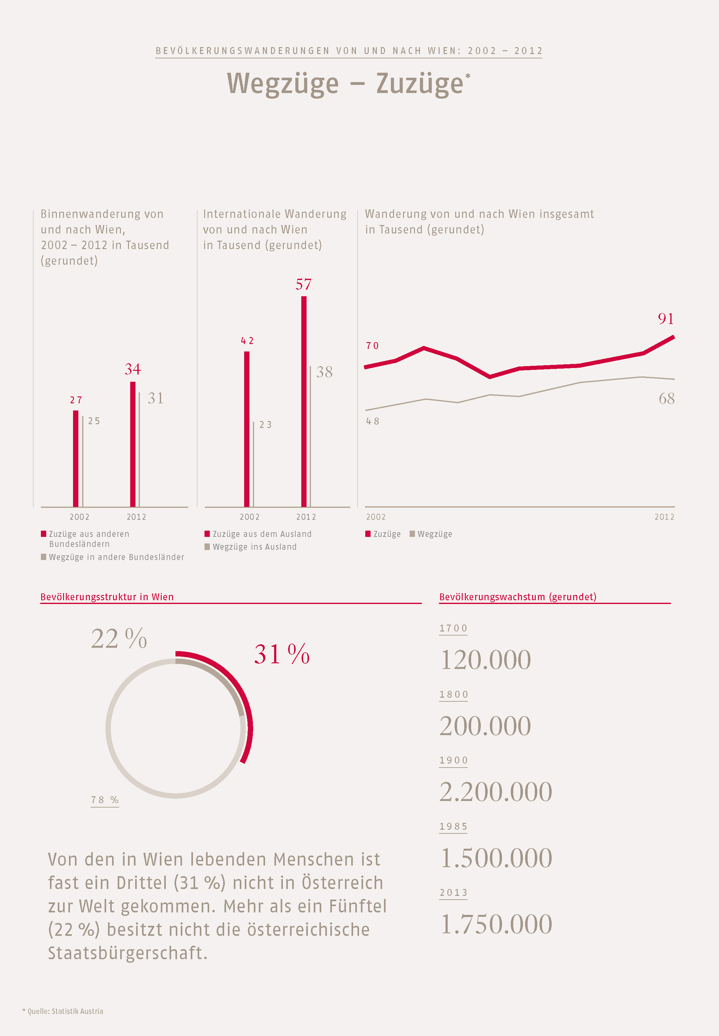 Ähnlich wie im 19. Jahrhundert ist Wien heute wieder Ziel für Zuwanderinnen und Zuwanderer aus dem In- und Ausland. Dies zeigt sich ganz deutlich in der Zusammensetzung der Bevölkerung. In ihr spiegeln sich sowohl die seinerzeitige Anwerbung von Arbeitskräften in den 1960er und frühen 1970er Jahren als auch die neuen Wanderungen nach 1990 wider.