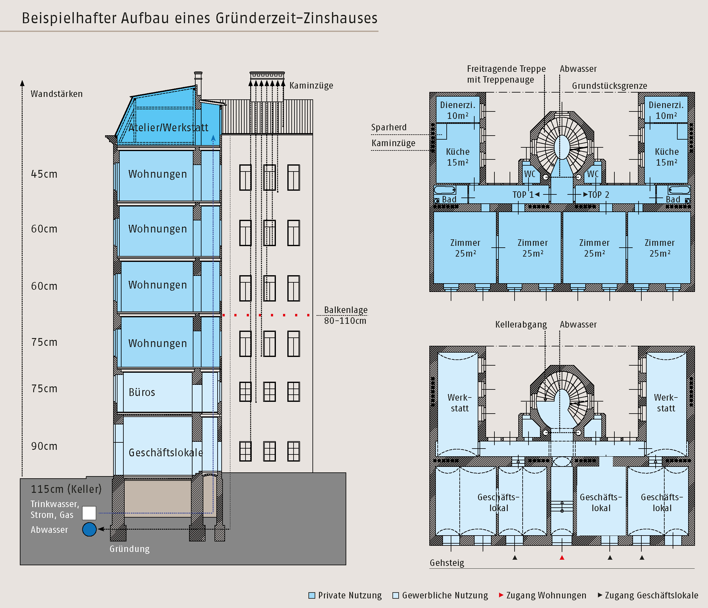 Zu den tragenden Wänden zählen die Umfassungswände (Außenwände), deckentragende und aussteifende Wände (Scheidewände), Wohnungstrennwände sowie Treppenhaus- und Brandwände. Als primäre Aufgaben der Mauern gelten Standsicherheit sowie Schutz gegen Witterung, Schall und Feuergefahr. Die Querschnitte der tragenden Wände in Gründerzeit-Zinshäusern verringern sich vom Keller bis zum Dach mit abnehmender Auflast. Die Bauordnung nannte hierfür fünf Richtlinien: Im obersten Stockwerk musste die Hauptmauer bei einer Raumtiefe von bis zu 6,5 m im Jahr 1859 etwa 30 cm stark sein, später erweitert auf 45 cm. Die Mauerstärke der darunter liegenden Stockwerke sollte um jeweils etwa 8 cm zunehmen; aus praktischen Erwägungen, um das Balkenauflager zu vergrößern und dem Ziegelmaß zu entsprechen, betrug die Verbreiterung in älteren Häusern oft aber 15 cm. Bei Verwendung von Dippelbaumdecken war ein Auflager von 16 cm vorgeschrieben. Kellerwände und Fundamente waren 15 cm stärker auszubilden als jene des Erdgeschoßes. Mittelmauern mussten so dimensioniert sein, dass eine „echte“ Ziegellänge als Abstand zwischen den Balkenauflagern bestand (29 cm, später 30 cm). Unter Beachtung einiger anderer baurechtlicher Faktoren konnte bei Anwendung dieser Mindestwandstärken der rechnerische Nachweis über die Standfestigkeit gegenüber der zuständigen Behörde unterbleiben. Diese Form der Normierung zum Zwecke der Zeitersparnis für Planer und Behörden ist auch bei anderen Bauteilen aus dieser Zeit belegt. Die maximale Bauhöhe war mit 13 Klaftern, etwa 25 Metern, festgesetzt.